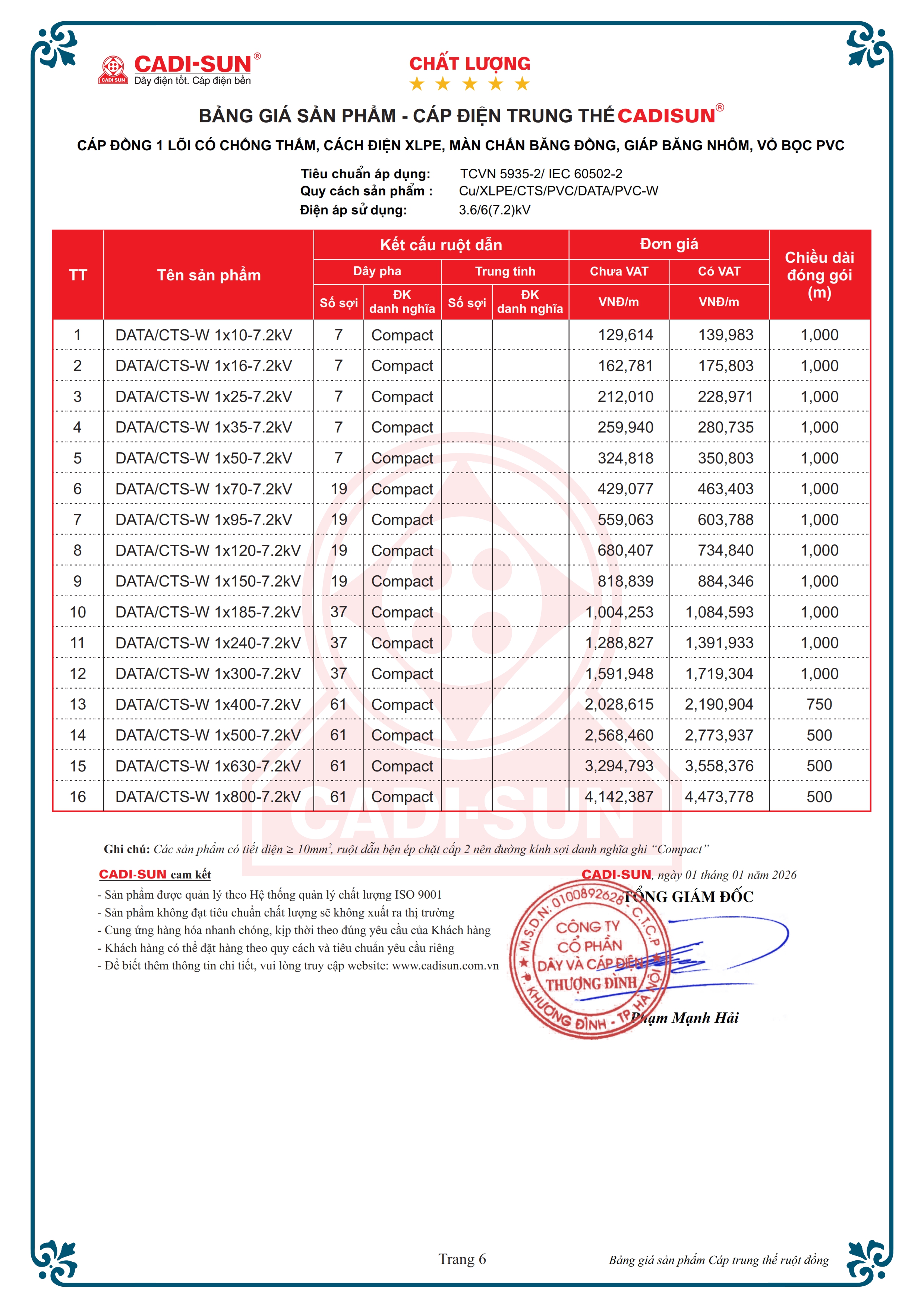 - Vật liệu: cách điện XLPE vỏ bọc PVC, Fr-PVC hoặc HDPE