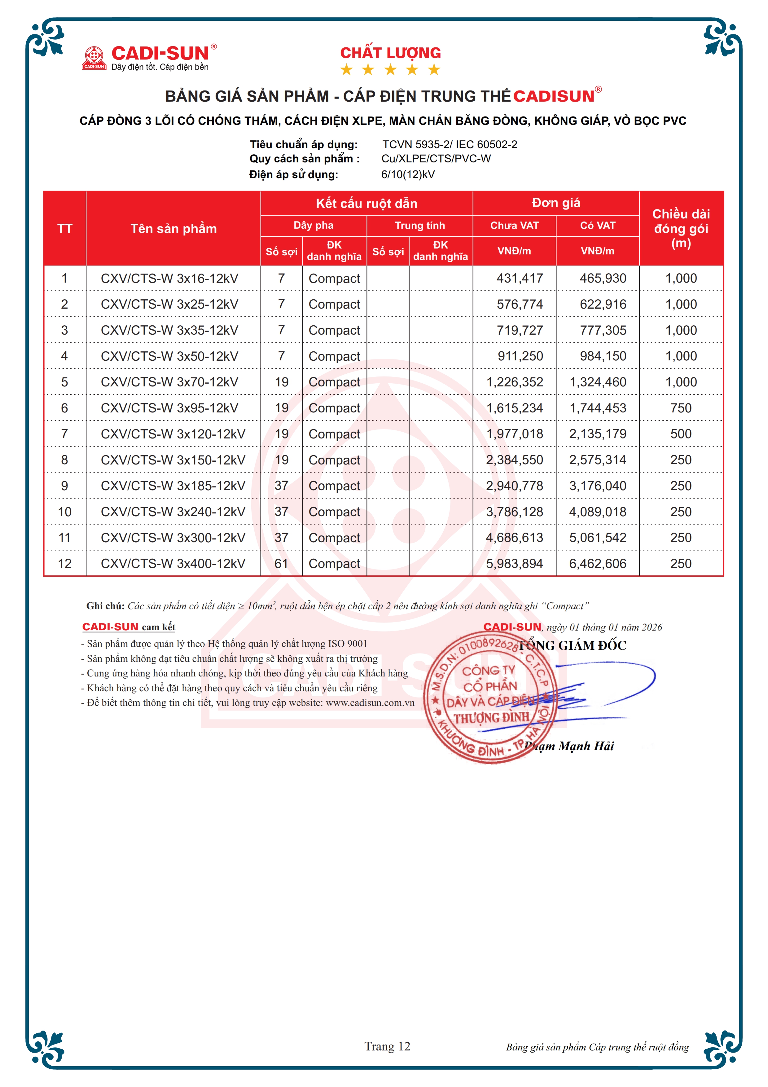 CÁP 3 LÕI ĐỒNG (NHÔM) CHỐNG THẤM, CÁCH ĐIỆN XLPE, MÀN CHẮN BĂNG ĐỒNG 0.127, VỎ BỌC PVC