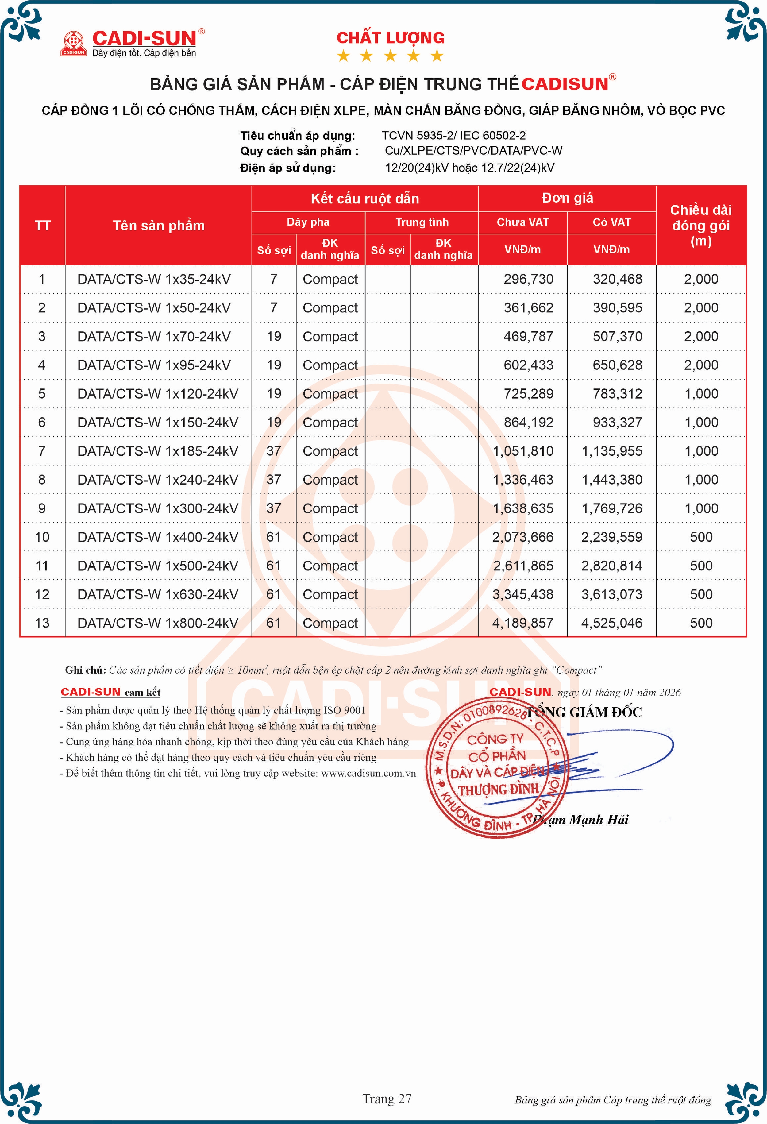 - Vật liệu: cách điện XLPE vỏ bọc PVC, Fr-PVC hoặc HDPE