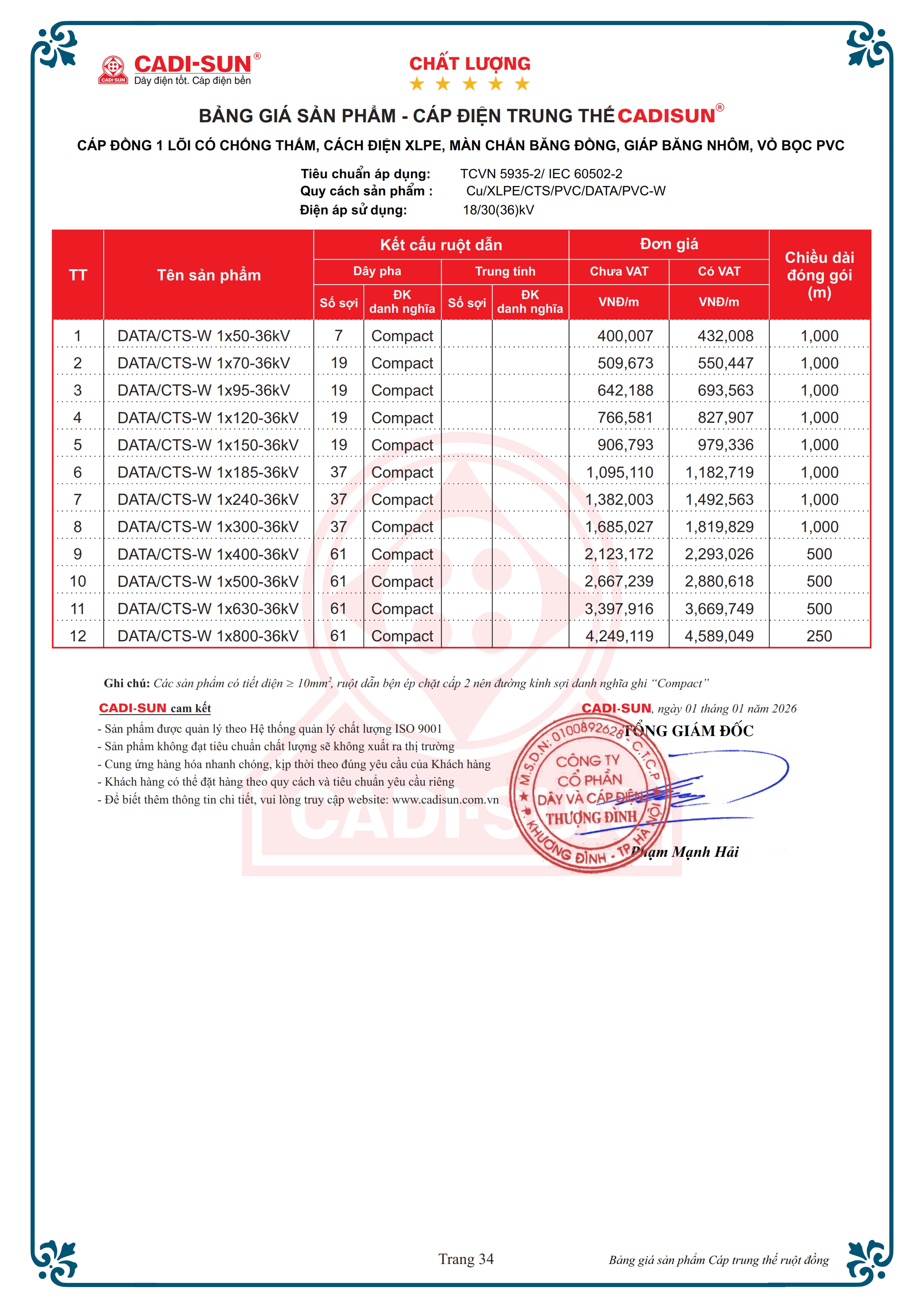 Tiêu chuẩn áp dụngTCVN 5935-2 / IEC 60502-2 và TCCS 17:2021/EVNTổng quan- Ruột dẫn: Nhôm hoặc đồng- Số lõi: 1, 3 và 4- Kiểu ruột dẫn: Bện tròn nén chặt cấp 2.- Mặt cắt danh định: Từ 10 mm2 đến 1000 mm2- Điện áp danh định: 3.6/6(7.2) kV đến 20/35 (40.5) kV- Nhiệt độ làm việc của ruột dẫn: 90 oC- Vật liệu: cách điện XLPE vỏ bọc PVC, Fr-PVC hoặc HDPE- Màn chắn kim loại là băng đồng CTS (CT), sợi đồng CWS hoặc kết hợp cả 2- Lớp giáp bảo vệ: Có giáp hoặc không có giáp- Dạng mẫu mã: Hình tròn.- Đóng gói: Ru lô hoặc cuộn- Tính năng đặc biệt (tùy chọn): Chống thấm dọc, ngang, chậm cháy- Ứng dụng: Dùng để truyền tải điện năng cho lưới điện trung thế, tần số công nghiệp, lắp đặt trên không, đi trong thang, máng, lắp đặt ngầm trực tiếp trong đất hoặc trong ống.* Ghi chú: Ngoài các quy cách nêu trên, CADI-SUN có thể đáp ứng các yêu cầu khác của khách hàng.