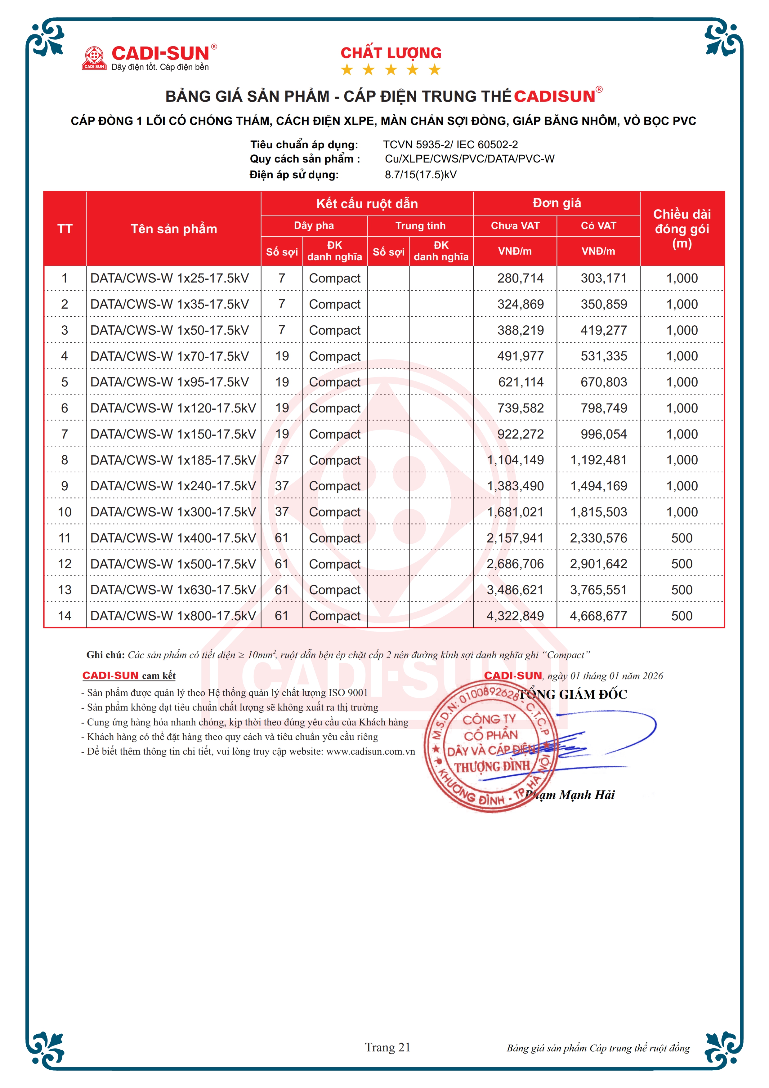 - Vật liệu: cách điện XLPE vỏ bọc PVC, Fr-PVC hoặc HDPE