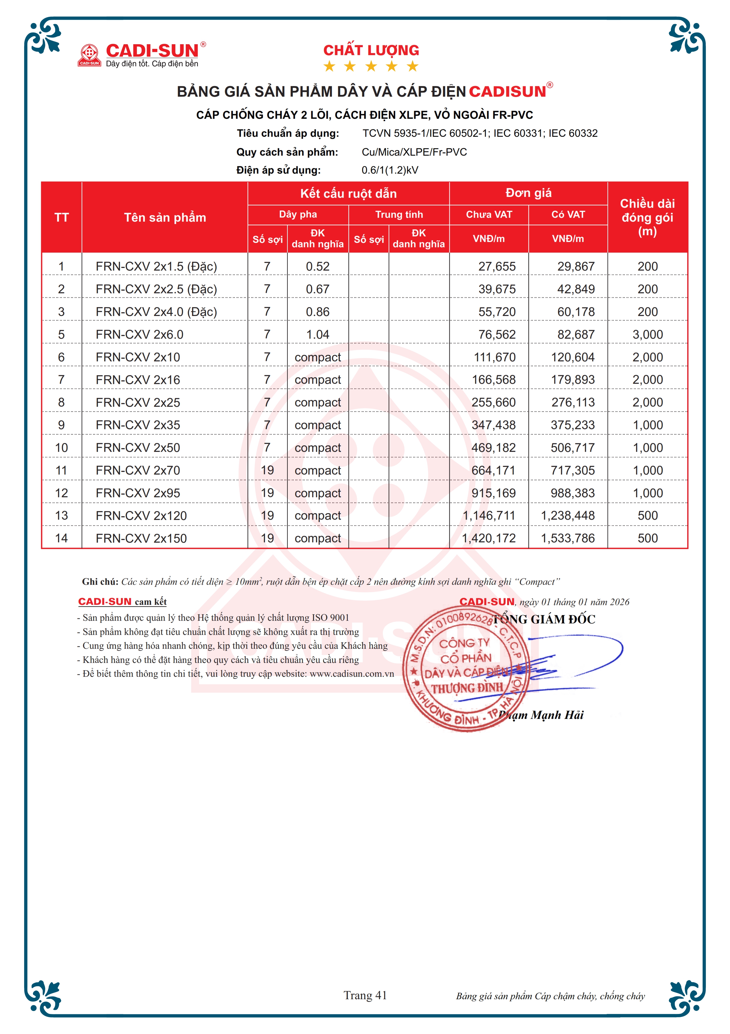 - Quy cách: Cu/Mica/XLPE/Fr-PVC