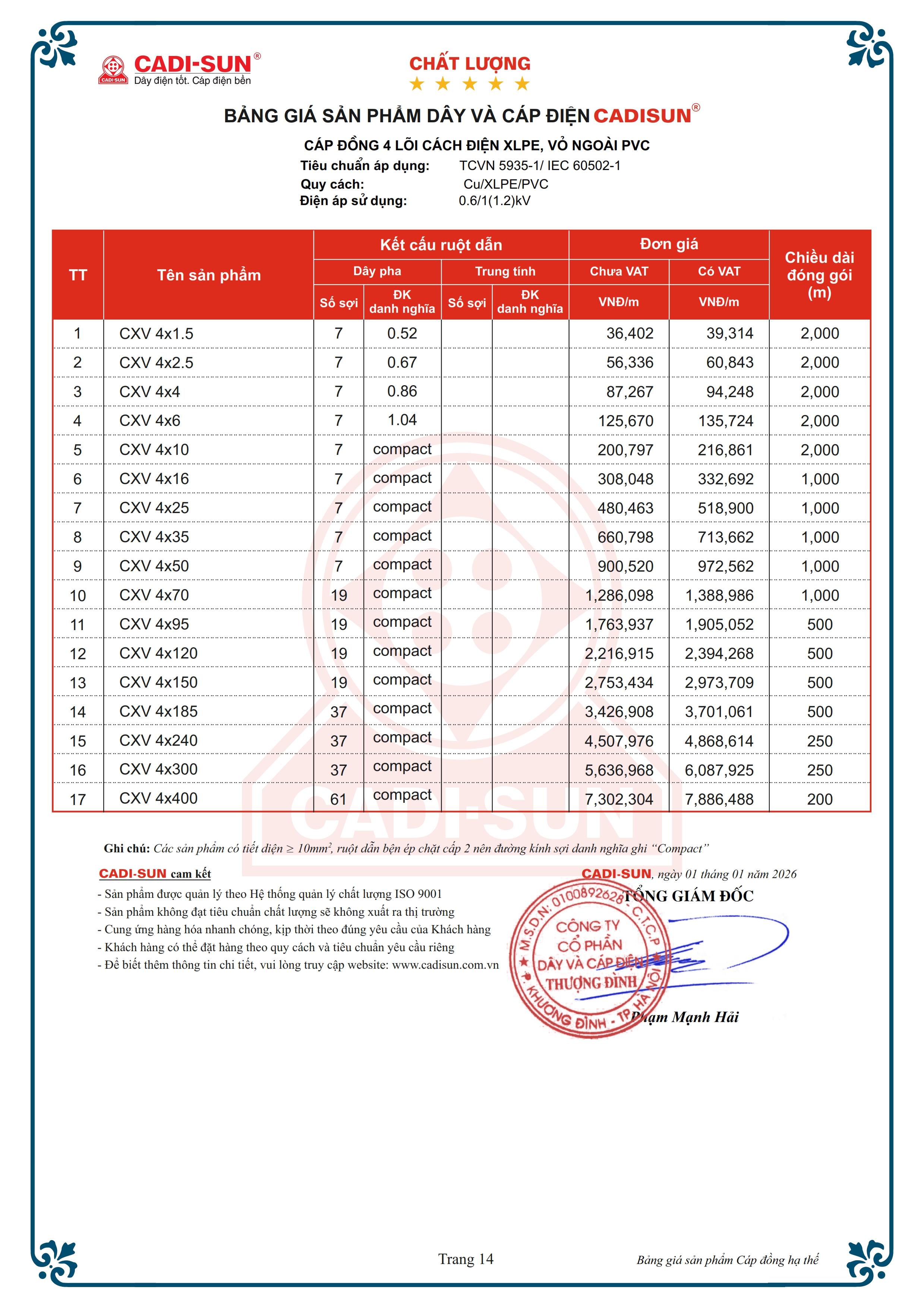 - Quy cách: Cu/XLPE/PVC