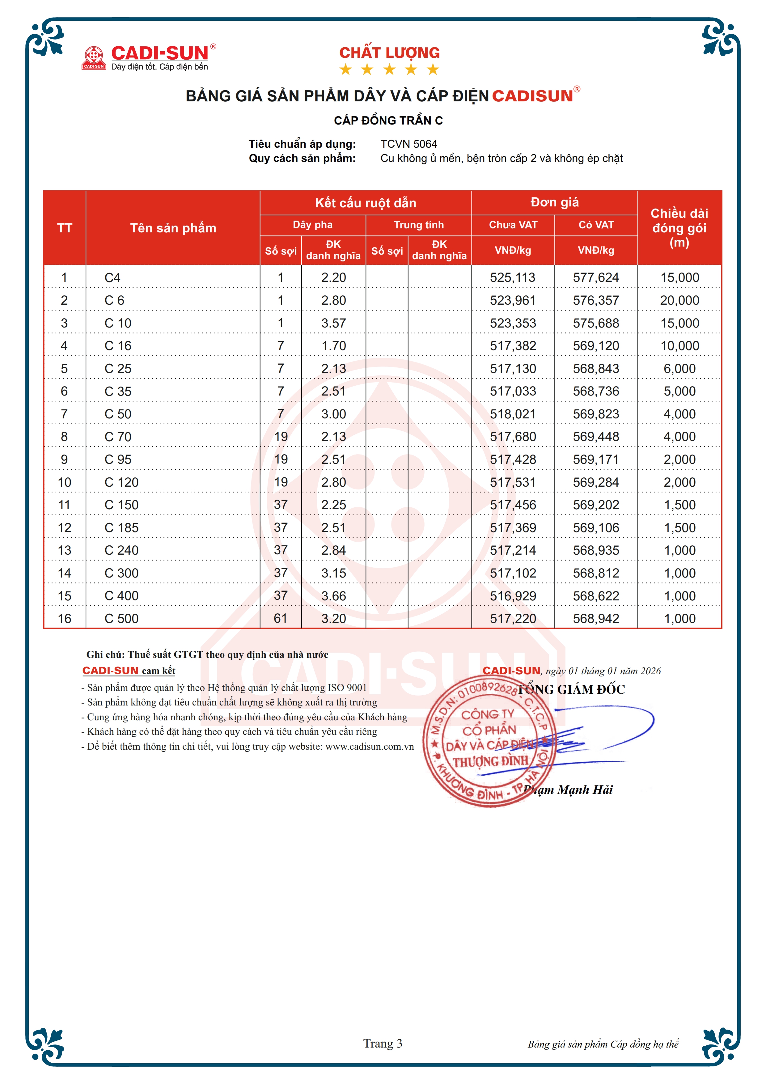 * Ghi chú: Ngoài các quy cách nêu trên, CADI-SUN có thể đáp ứng các yêu cầu khác của khách hàng.