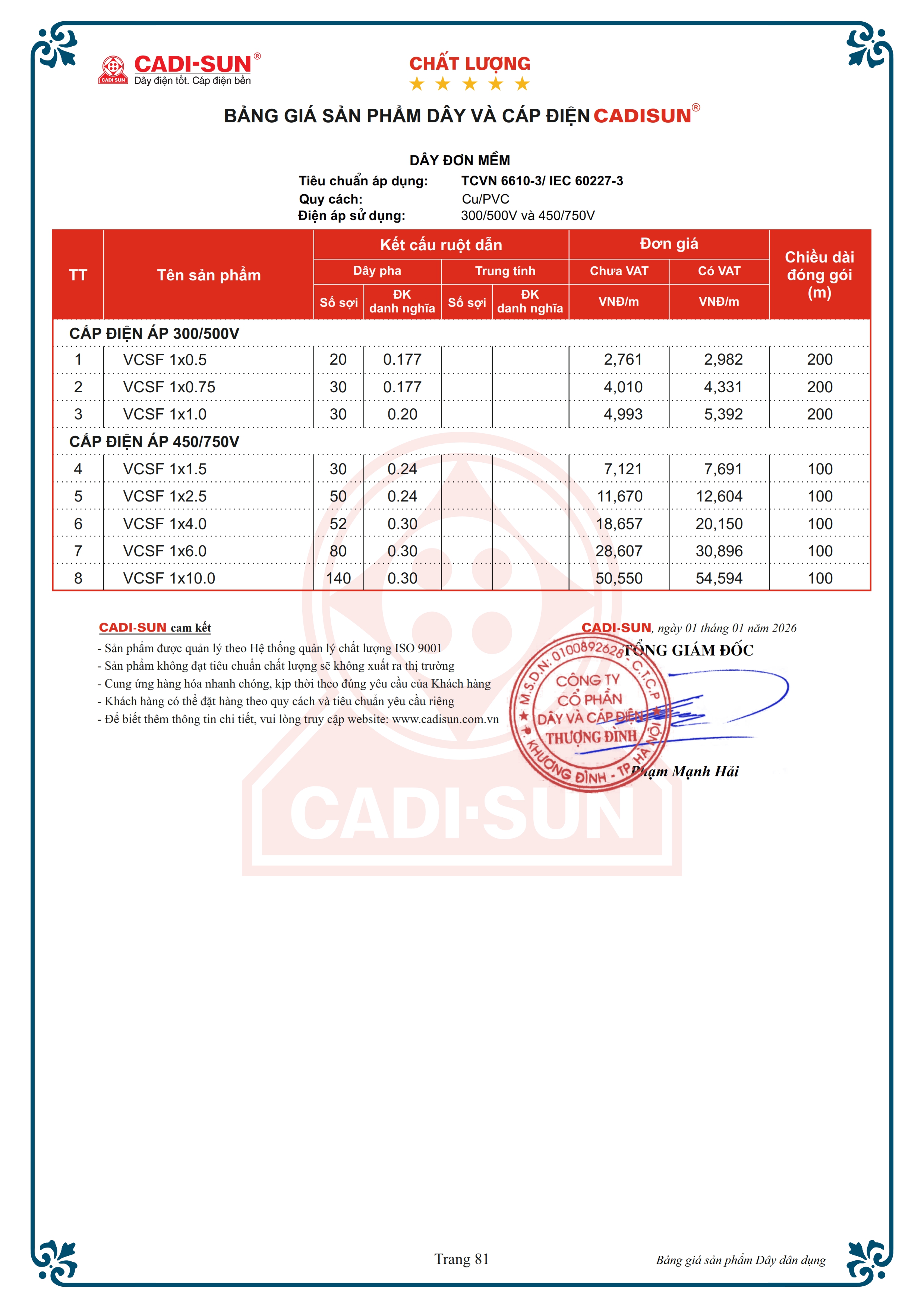 - Mặt cắt danh định: từ 0.5 mm2 đến 240 mm2