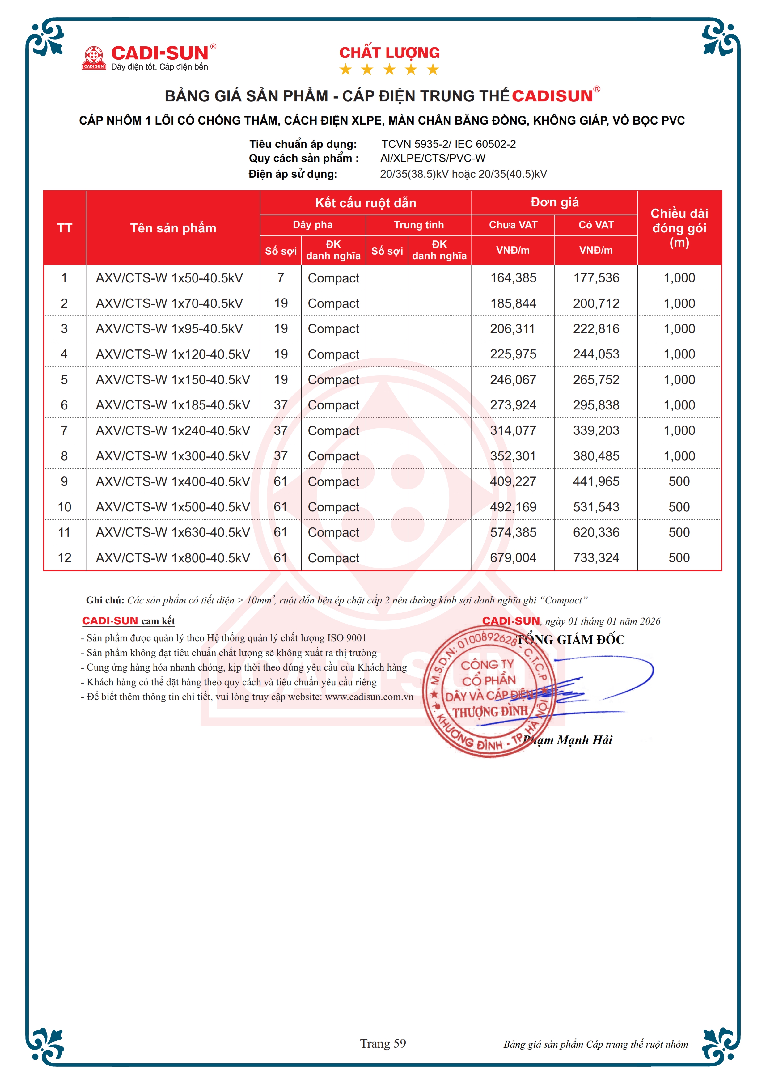 - Vật liệu: cách điện XLPE vỏ bọc PVC, Fr-PVC hoặc HDPE