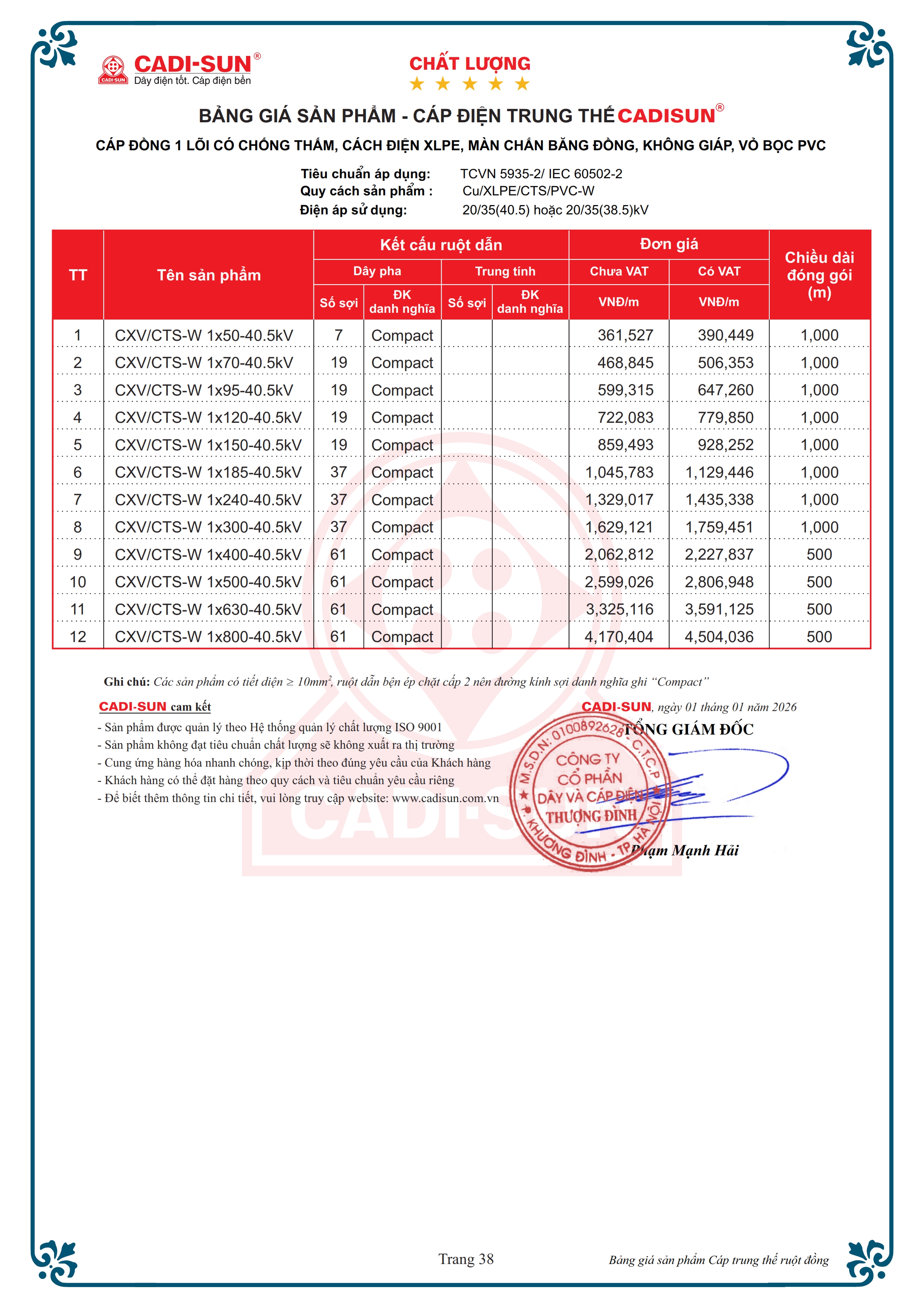 Cáp 1 lõi, màn chắn băng đồng, không giáp - CXV(AXV)/CTS-W 1x? - 20/35(40.5) kV hoặc 20/35(38.5) kV