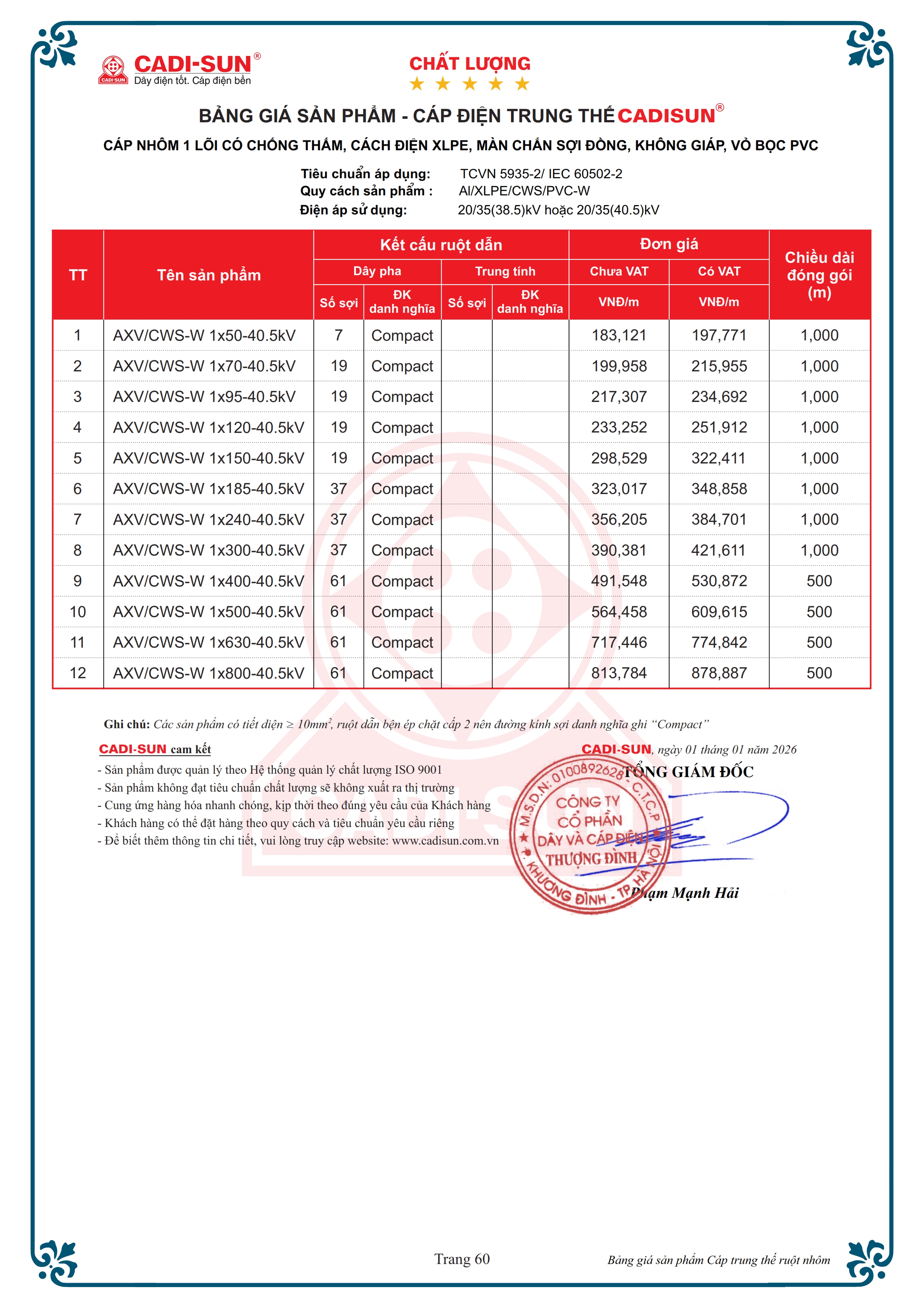 Tiêu chuẩn áp dụngGB/T 12706.3, TCVN 5935-2 / IEC 60502-2 và TCCS 17:2021/EVNTổng quan- Ruột dẫn: Nhôm hoặc đồng- Số lõi: 1, 3 và 4- Kiểu ruột dẫn: Bện tròn nén chặt cấp 2.- Mặt cắt danh định: Từ 10 mm2 đến 1000 mm2- Điện áp danh định: 3.6/6(7.2) kV đến 20/35 (40.5) kV- Nhiệt độ làm việc của ruột dẫn: 90 oC- Vật liệu: cách điện XLPE vỏ bọc PVC, Fr-PVC hoặc HDPE- Màn chắn kim loại là băng đồng CTS (CT), sợi đồng CWS hoặc kết hợp cả 2- Lớp giáp bảo vệ: Có giáp hoặc không có giáp- Dạng mẫu mã: Hình tròn.- Đóng gói: Ru lô hoặc cuộn- Tính năng đặc biệt (tùy chọn): Chống thấm dọc, ngang, chậm cháy- Ứng dụng: Dùng để truyền tải điện năng cho lưới điện trung thế, tần số công nghiệp, lắp đặt trên không, đi trong thang, máng, lắp đặt ngầm trực tiếp trong đất hoặc trong ống.* Ghi chú: Ngoài các quy cách nêu trên, CADI-SUN có thể đáp ứng các yêu cầu khác của khách hàng.