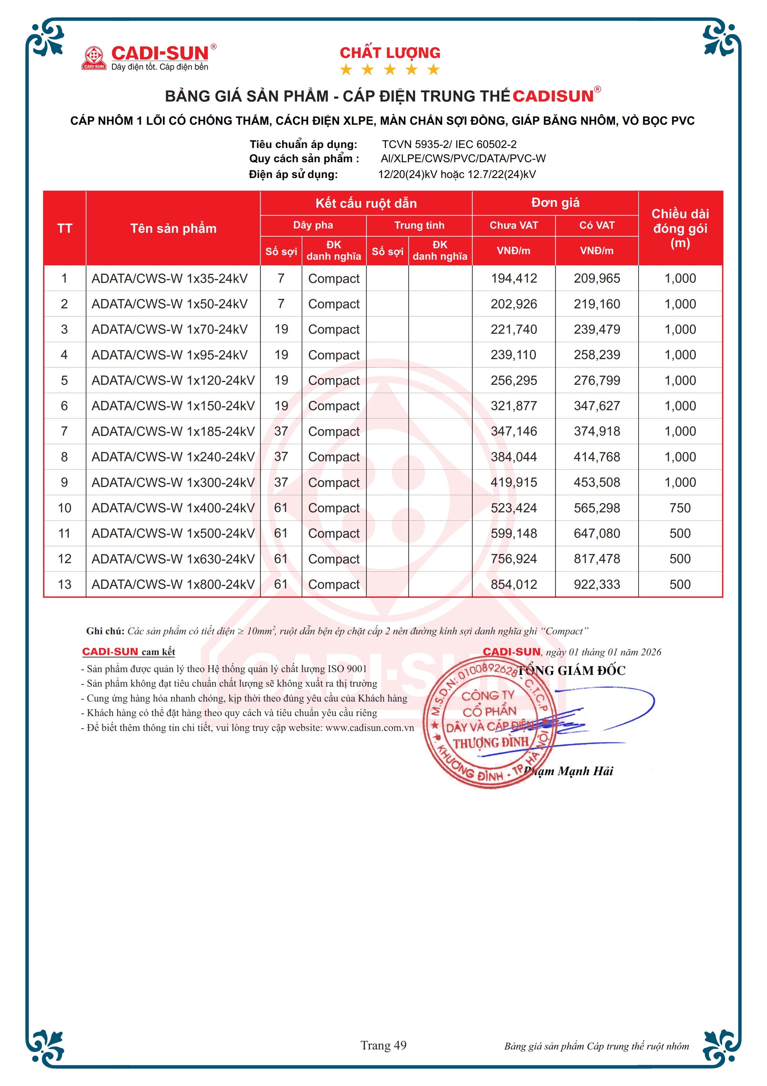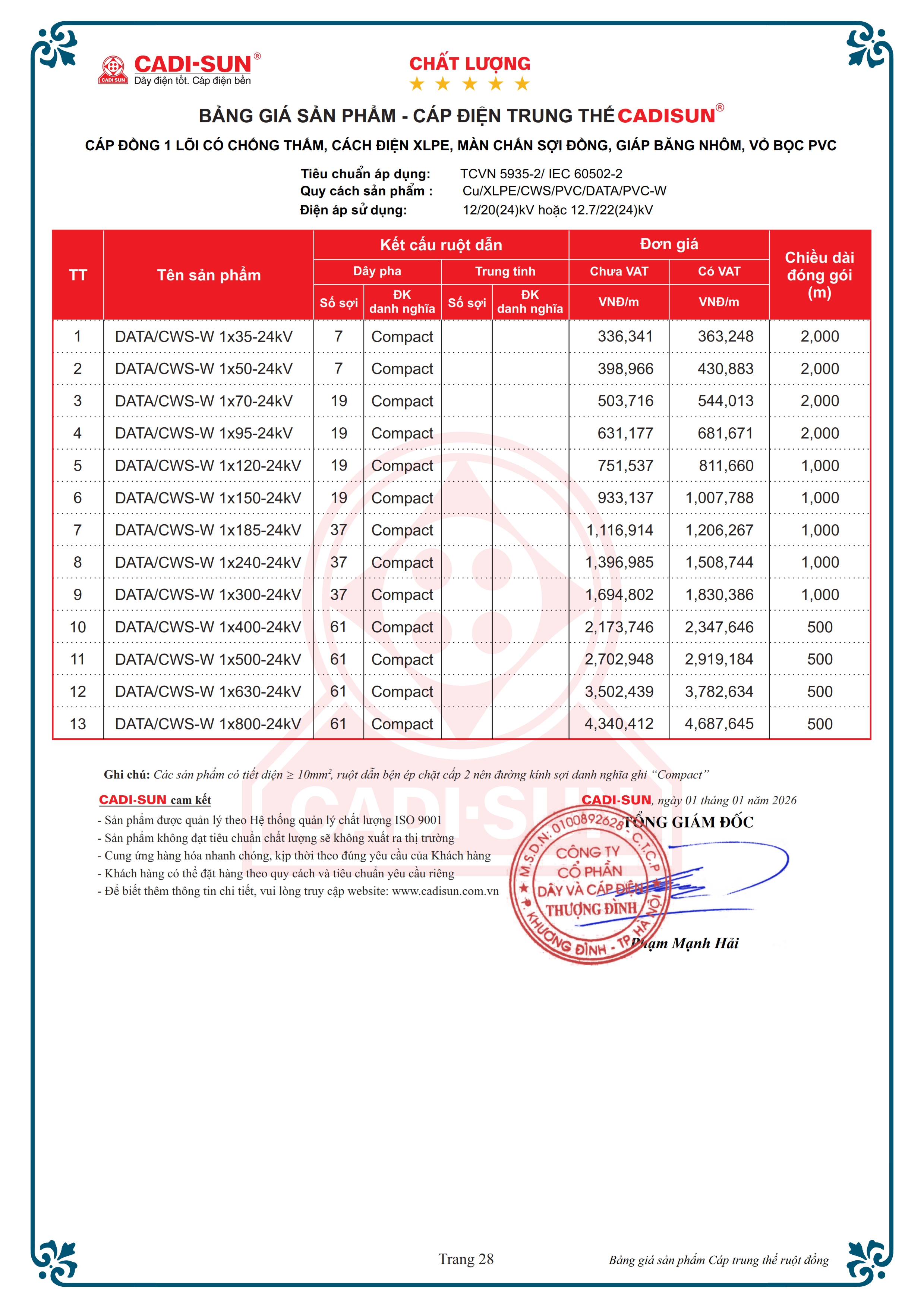 Tiêu chuẩn áp dụngTCVN 5935-2 / IEC 60502-2 và TCCS 17:2021/EVNTổng quan- Ruột dẫn: Nhôm hoặc đồng- Số lõi: 1, 3 và 4- Kiểu ruột dẫn: Bện tròn nén chặt cấp 2.- Mặt cắt danh định: Từ 10 mm2 đến 1000 mm2- Điện áp danh định: 3.6/6(7.2) kV đến 20/35 (40.5) kV- Nhiệt độ làm việc của ruột dẫn: 90 oC- Vật liệu: cách điện XLPE vỏ bọc PVC, Fr-PVC hoặc HDPE- Màn chắn kim loại là băng đồng CTS (CT), sợi đồng CWS hoặc kết hợp cả 2- Lớp giáp bảo vệ: Có giáp hoặc không có giáp- Dạng mẫu mã: Hình tròn.- Đóng gói: Ru lô hoặc cuộn- Tính năng đặc biệt (tùy chọn): Chống thấm dọc, ngang, chậm cháy- Ứng dụng: Dùng để truyền tải điện năng cho lưới điện trung thế, tần số công nghiệp, lắp đặt trên không, đi trong thang, máng, lắp đặt ngầm trực tiếp trong đất hoặc trong ống.* Ghi chú: Ngoài các quy cách nêu trên, CADI-SUN có thể đáp ứng các yêu cầu khác của khách hàng.