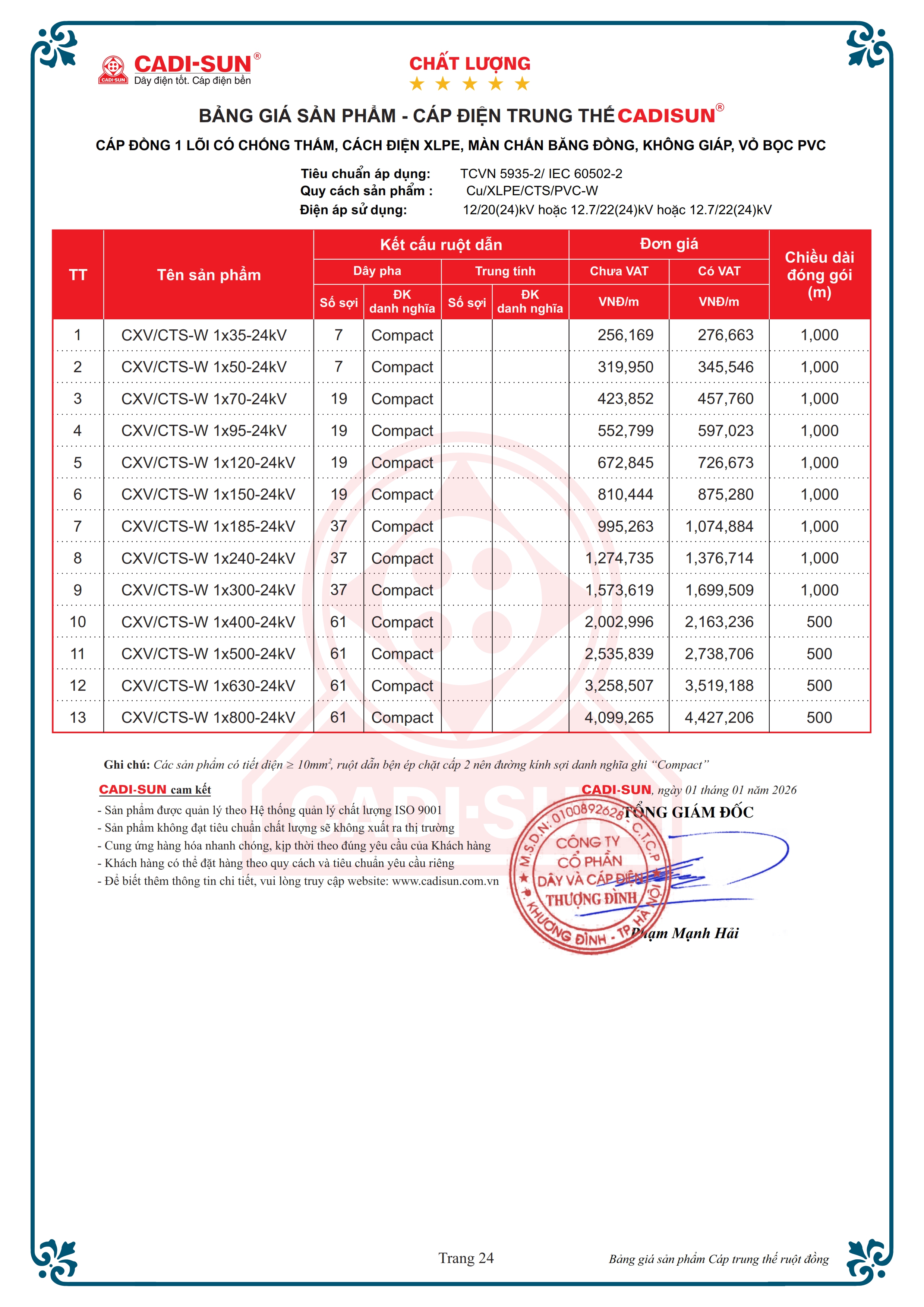 Tiêu chuẩn áp dụngTCVN 5935-2 / IEC 60502-2 và TCCS 17:2021/EVNTổng quan- Ruột dẫn: Nhôm hoặc đồng- Số lõi: 1, 3 và 4- Kiểu ruột dẫn: Bện tròn nén chặt cấp 2.- Mặt cắt danh định: Từ 10 mm2 đến 1000 mm2- Điện áp danh định: 3.6/6(7.2) kV đến 20/35 (40.5) kV- Nhiệt độ làm việc của ruột dẫn: 90 oC- Vật liệu: cách điện XLPE vỏ bọc PVC, Fr-PVC hoặc HDPE- Màn chắn kim loại là băng đồng CTS (CT), sợi đồng CWS hoặc kết hợp cả 2- Lớp giáp bảo vệ: Có giáp hoặc không có giáp- Dạng mẫu mã: Hình tròn.- Đóng gói: Ru lô hoặc cuộn- Tính năng đặc biệt (tùy chọn): Chống thấm dọc, ngang, chậm cháy- Ứng dụng: Dùng để truyền tải điện năng cho lưới điện trung thế, tần số công nghiệp, lắp đặt trên không, đi trong thang, máng, lắp đ���t ngầm trực tiếp trong đất hoặc trong ống.* Ghi chú: Ngoài các quy cách nêu trên, CADI-SUN có thể đáp ứng các yêu cầu khác của khách hàng.