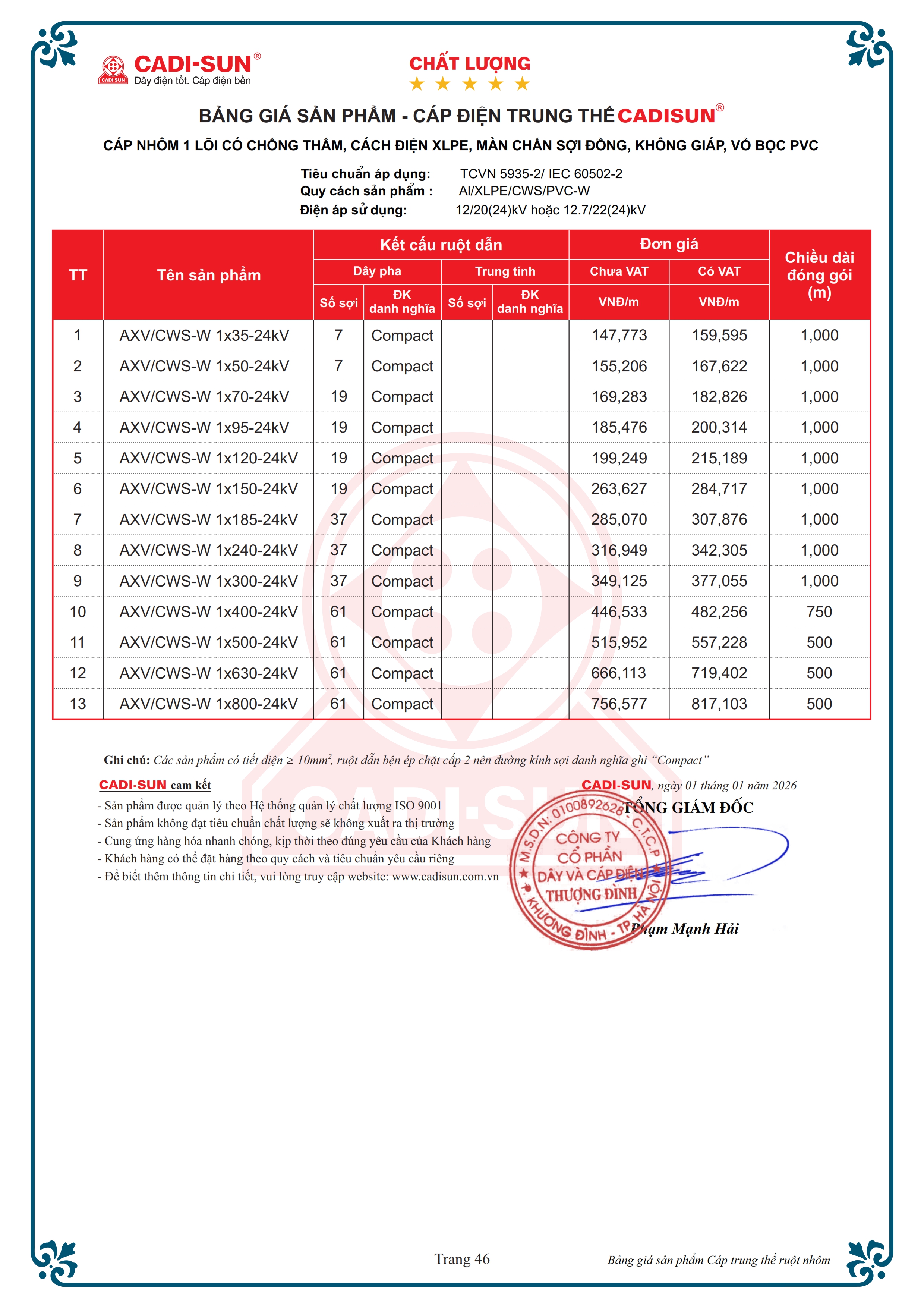- Vật liệu: cách điện XLPE vỏ bọc PVC, Fr-PVC hoặc HDPE