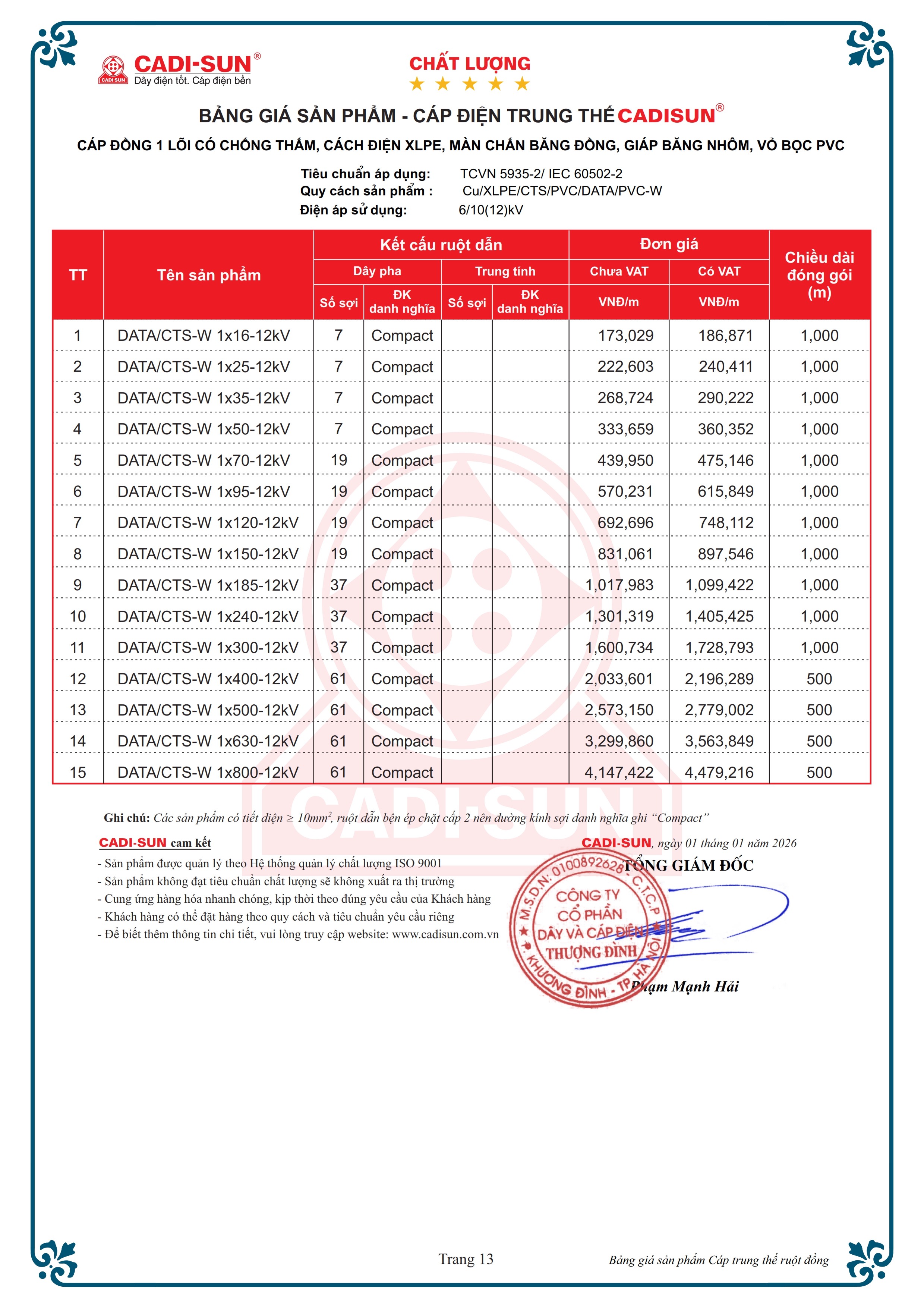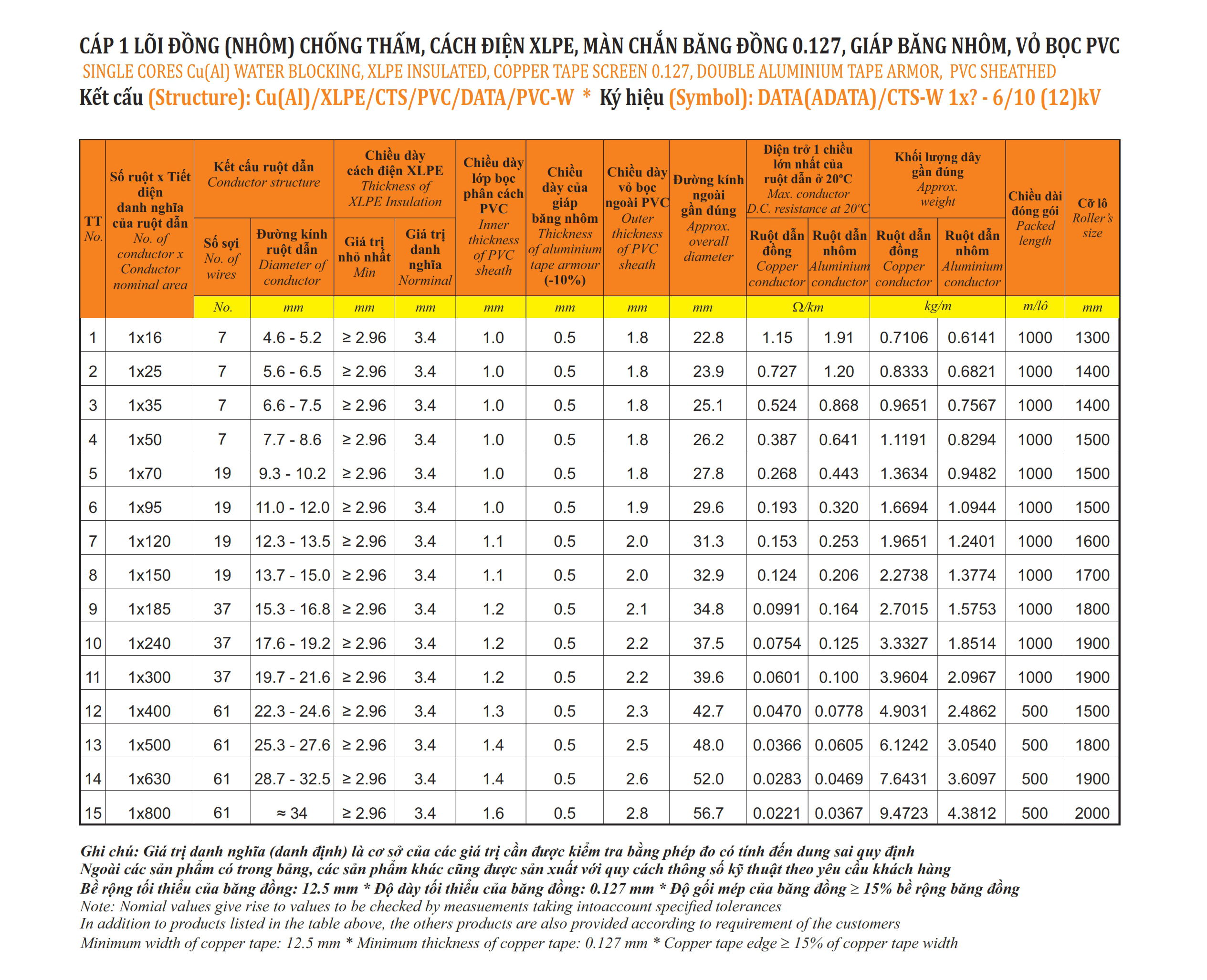 - Vật liệu: cách điện XLPE vỏ bọc PVC, Fr-PVC hoặc HDPE