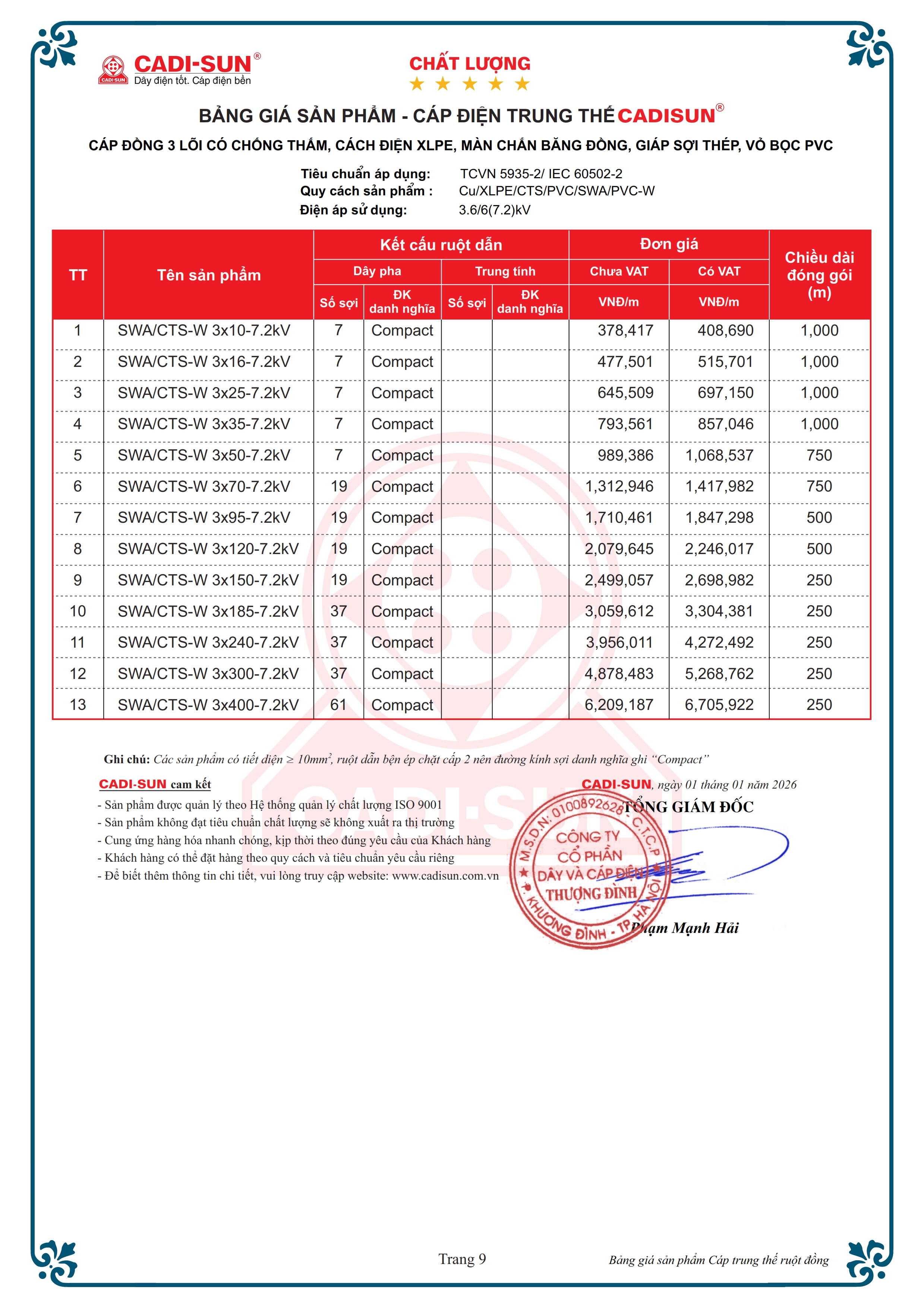 Cáp 3 lõi, màn chắn băng đồng, giáp sợi thép - SWA(ASWA)/CTS-W 3x? - 3.6/6 (7.2)kV