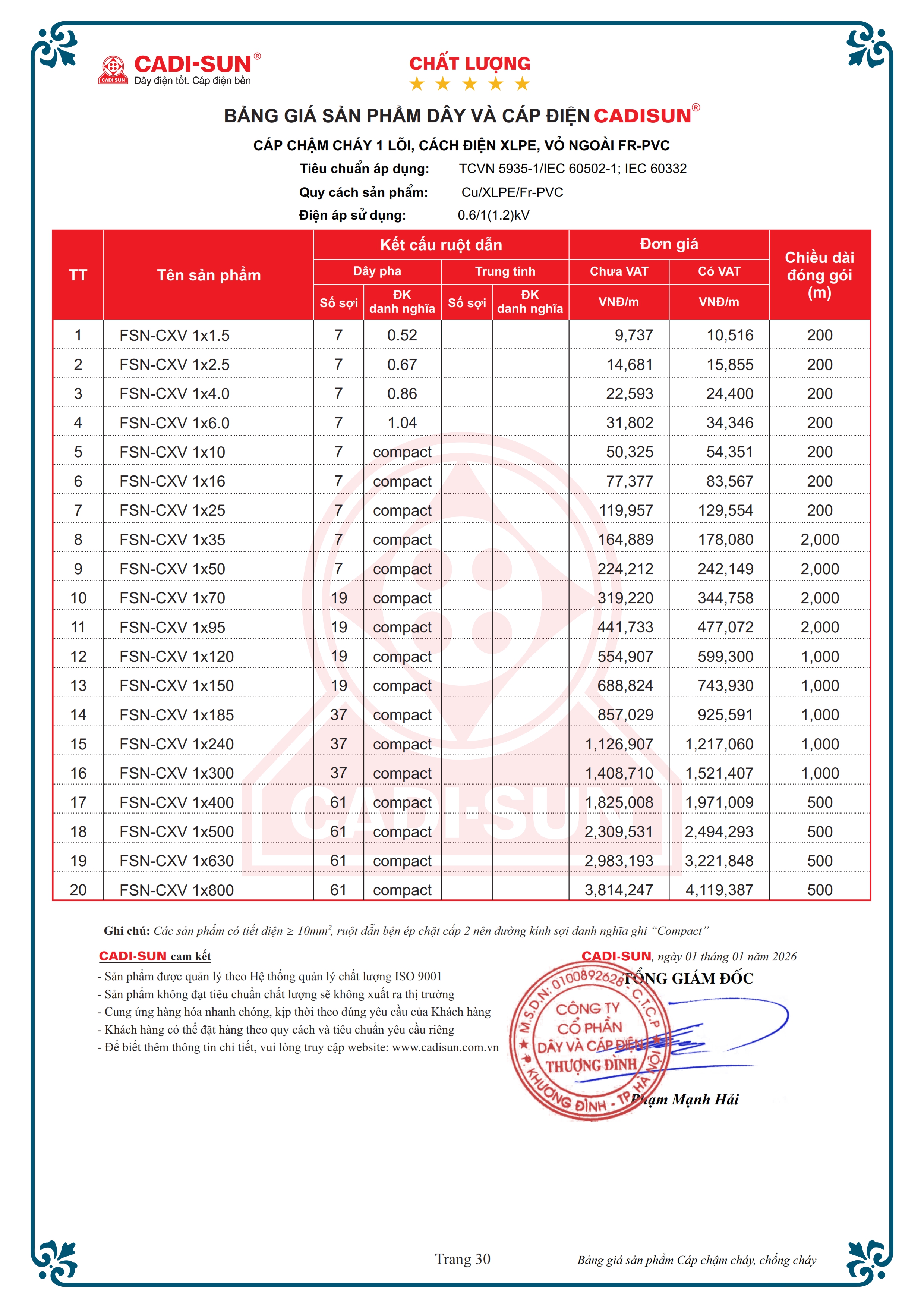 - Mặt cắt danh định: Từ 1.5 mm2 đến 1000 mm2