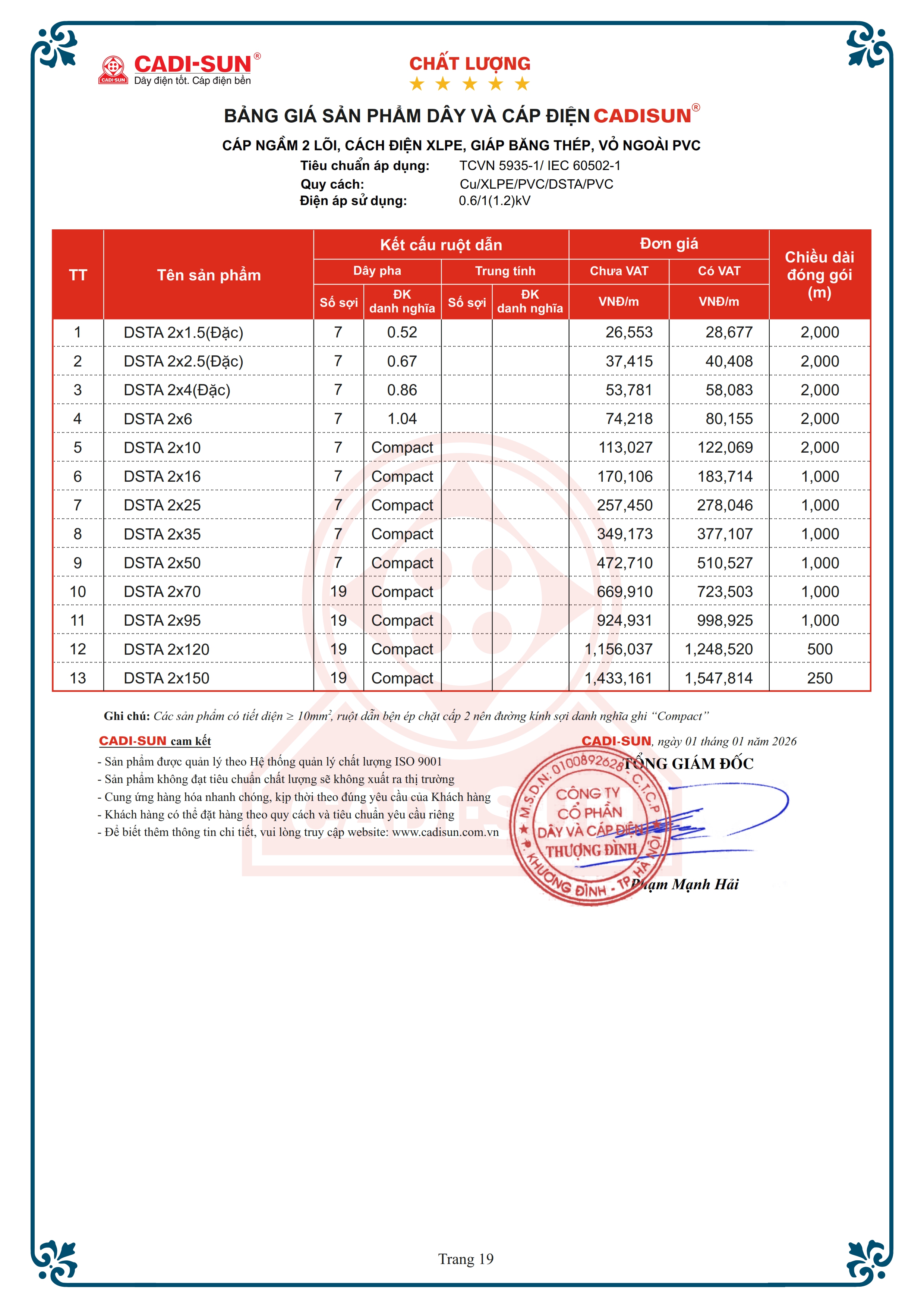 - Quy cách: Cu/XLPE/PVC/DSTA/PVC