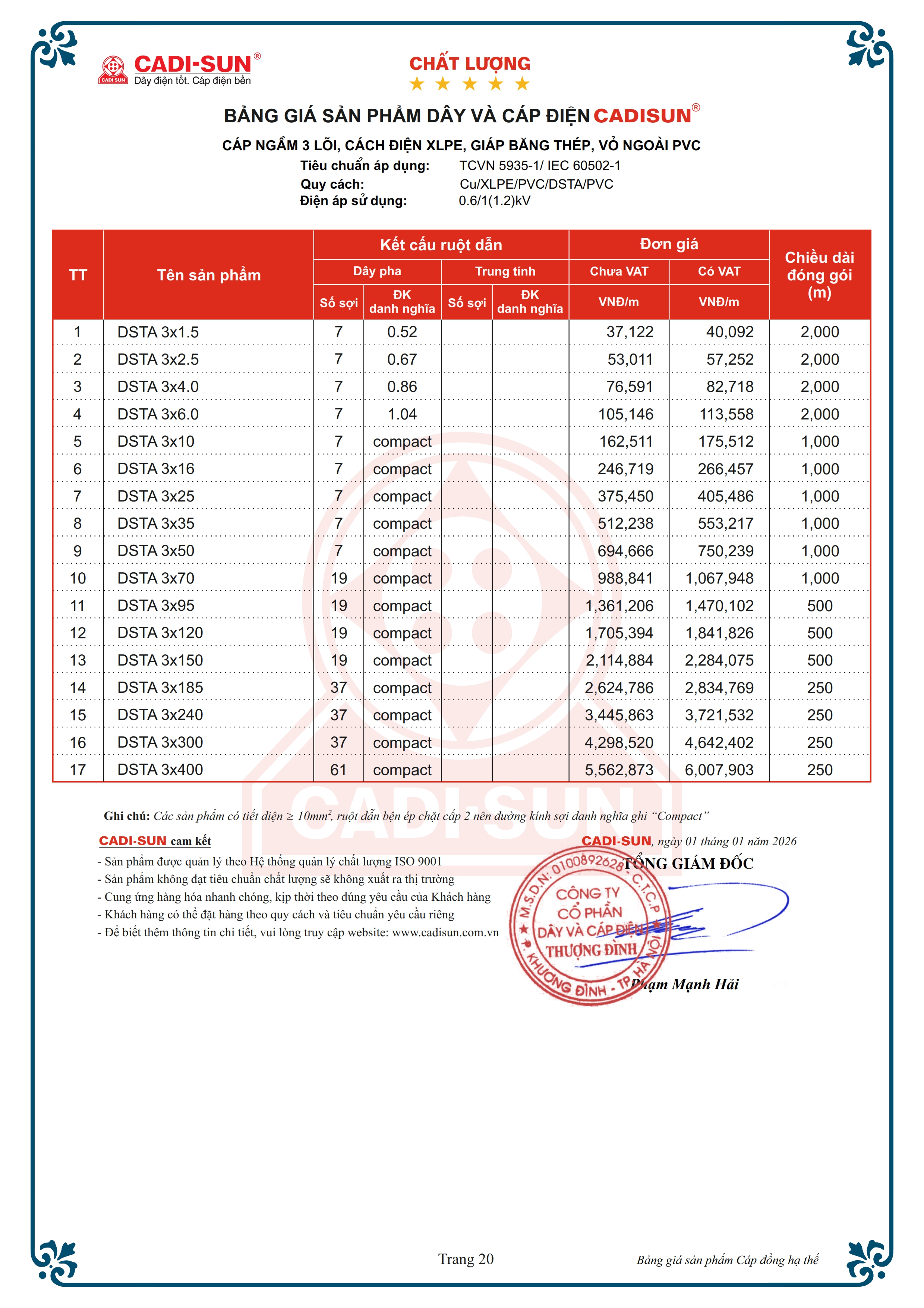 - Quy cách: Cu/XLPE/PVC/DSTA/PVC