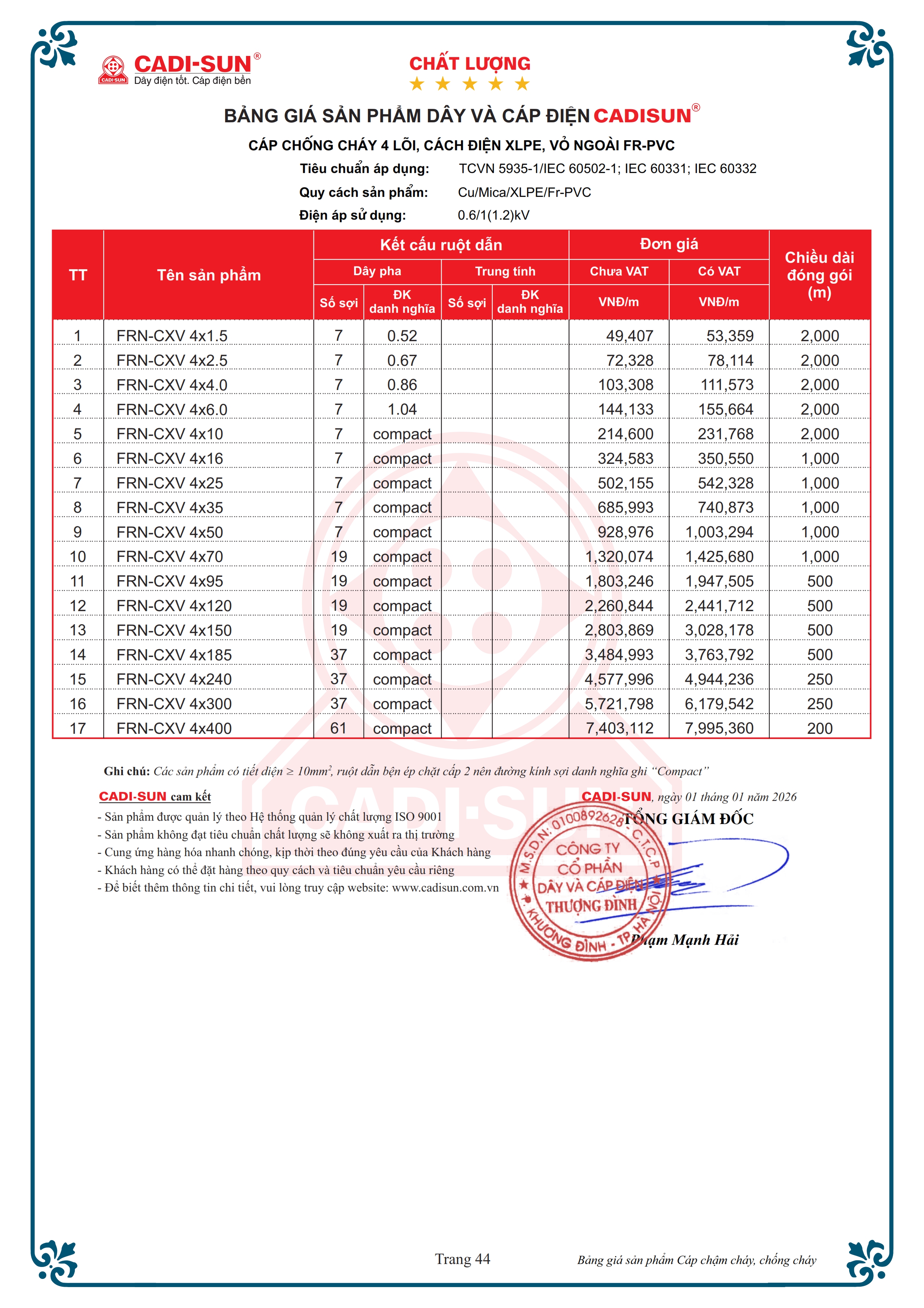 - Quy cách: Cu/Mica/XLPE/Fr-PVC